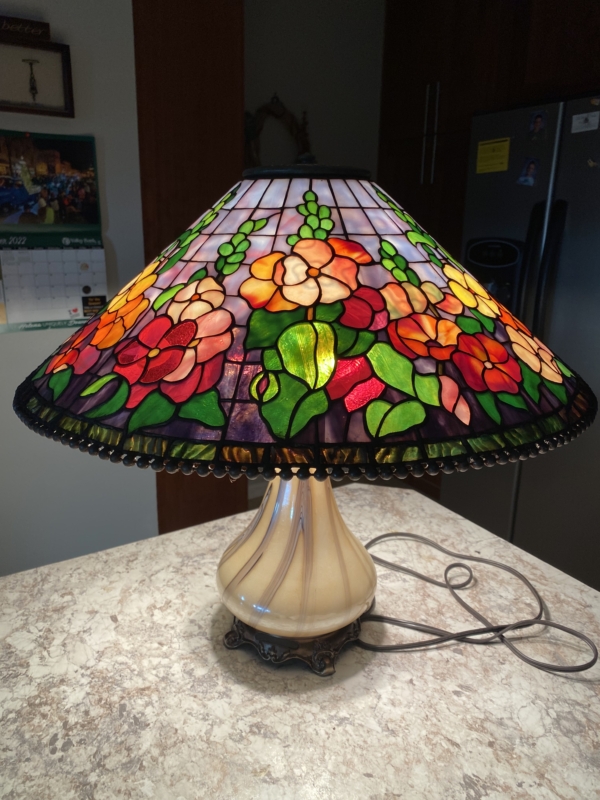 This is a reproduction based on a Tiffany design. IT WILL FIT ON AN ODYSSEY 20″ DRAGONFLY CONE FORM! (T1495) This pattern will be MAILED, complete with 2 paper patterns and one polypropylene sheet to glue onto the existing form. Polypropylene is a plastic, like mylar, but white. It can easily be adhered to your Odyssey form with a spray adhesive and is virtually tear proof! 3 repeats.